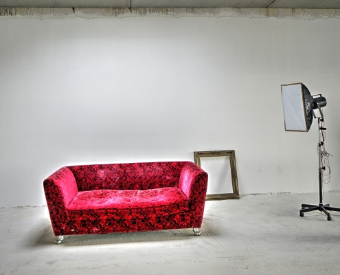 Auf dem gemütlichen roten Sofa können es sich Begleitpersonen bequem machen, oder wir bauen es in das Shooting ein.